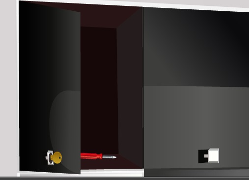 Zoom in on the cupboard and open the left-most door. Take the gold key.